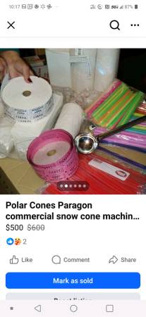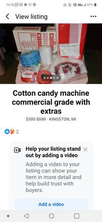 For sale is a commercial cotton candy machine. Works perfectly well maintained. I want $500 for it. I bought this for $675. I also have a lot of supplies for it the cones the bags the little ties for the bags and some rolls of tickets. Also this has the dome which is $90 but included in this deal and a brand new mesh liner for the inside of it with its clips which is another $40. All included in this deal. Great for Church events open houses Carnival really anything super fun to use and super fun to have.