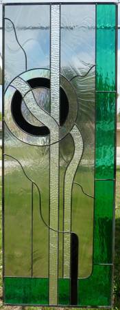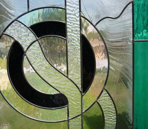 large stained glass window size: 23 7/8" x 63 7/8" contemporary, lead channel. more about this panel: https://ambientmoon.com/images/con019.htm no broken pieces, excellent quality work. cash only