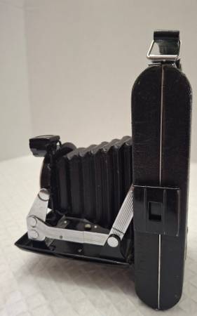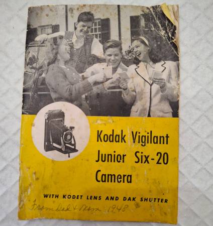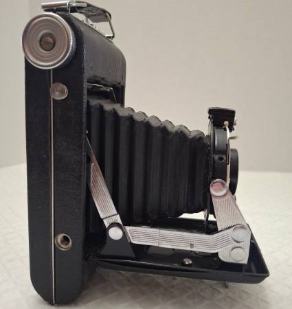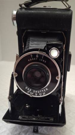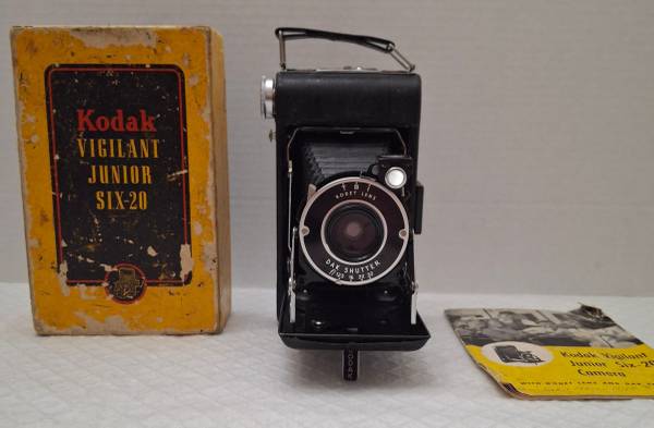 Includes original box and instructions for collectors and enthusiasts. Equipped with a Kodet meniscus lens and Dak shutter, offering shutter speeds of “I” (instant), “B” (bulb), and “T” (time). It uses 620 roll film to produce 6x9cm images (8 per roll). Please note, modern users will need to respool 120 film onto 620 spools.