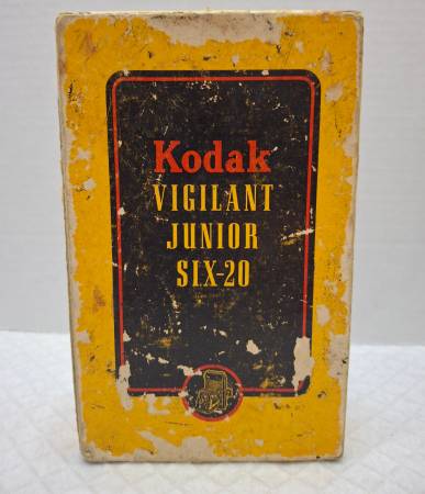 Discover a piece of photographic history with this vintage Kodak Vigilant Junior Six-20 camera, produced between 1940 and 1948 in the USA. This classic folding, self-erecting camera features a stylish Streamline Moderne-era curved body covered in fine-grain leatherette, making it as visually striking as it is functional.