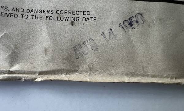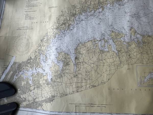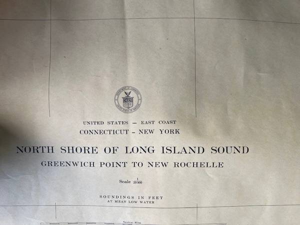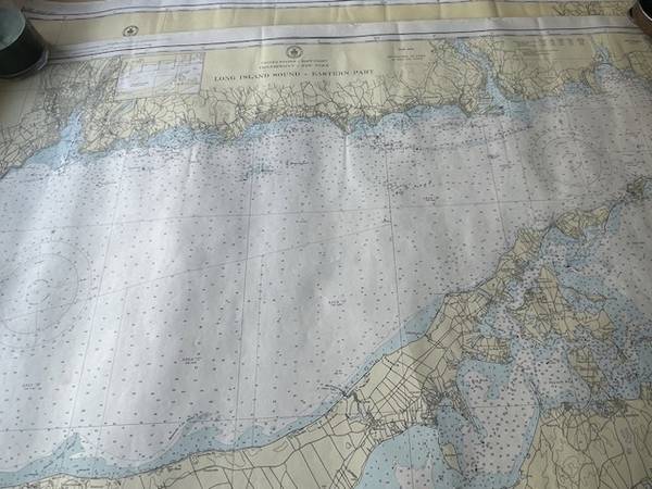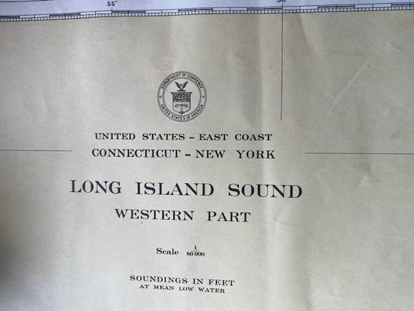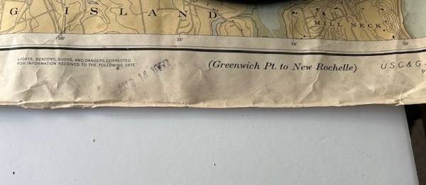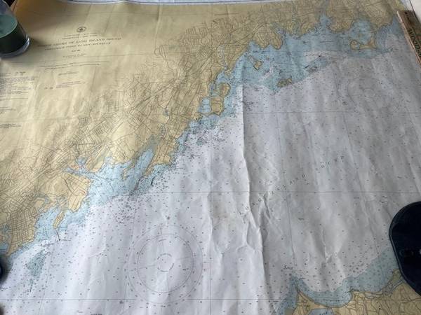 A little bit of an unusual item. This is an authentic nautical map case with original maps of New Jersey shorelines dating from the 1940’s and 1950’s. The map case is awesome. It is made of Zinc I believe with a brass lid. The case measures 37 inches tall. Rolled up inside the case are 4 maps. Circa 1950 #1222 Ling Island Sound Eastern Part, circa 1940 #1213, Long Island Sound western Part. There are two maps #1212, circa 1948/1949 Long Island Eastern Part. The maps are official United States Coast Guard Nautical Maps.