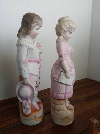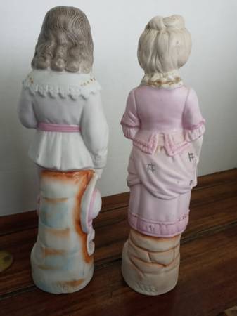 Purchased in 1926. Pink. Clothing is styled in late 16th to early 19th century fashion. 10 inches tall, 2 & 1/2 inches wide. Base is 2 & 1/2 inches in diameter. Like new. No chips, cracks, or repairs. Unknown manufacturer. On the back of the man is 5264 and on the back of the woman is 5333. $33 for the pair.