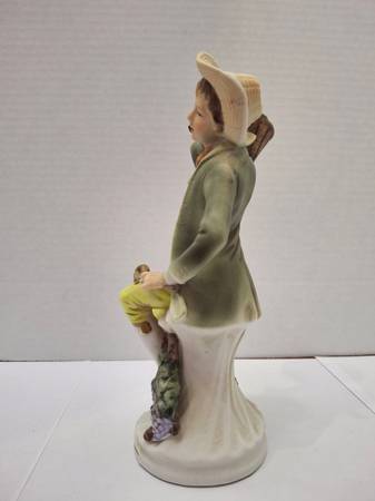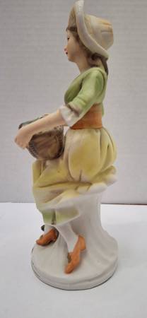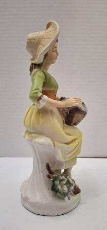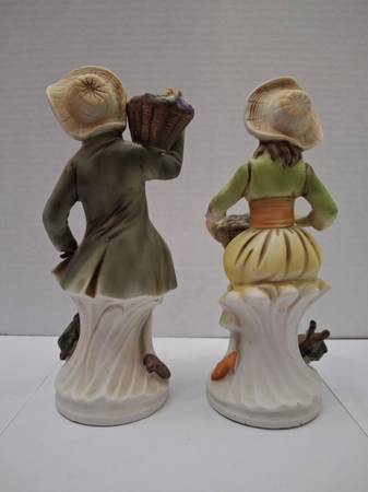 These popular vintage figurines, also known as the "Vineyard Harvest" or "Tuscan Boy & Girl with Grapes," were released in 1978 by Homco (Home Interiors & Gifts). They depict a young couple harvesting grapes, and are made of bisque porcelain, with soft, muted colors like olive green, yellow, purple, and orange. On the upper right of the girl’s hat, the dark spot is a speck of dark brown paint from the decorating process. Each is approximately 8” tall with a 3” diameter base. No chips, cracks, or scratches. $28 for the pair.