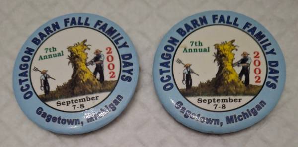 Unique collection of 7 vintage buttons from the historic Octagon Barn Fall Family Days in Gagetown. Includes: - 2 buttons from the 6th Annual event (September 8-9, 2001) - 2 buttons from the 7th...