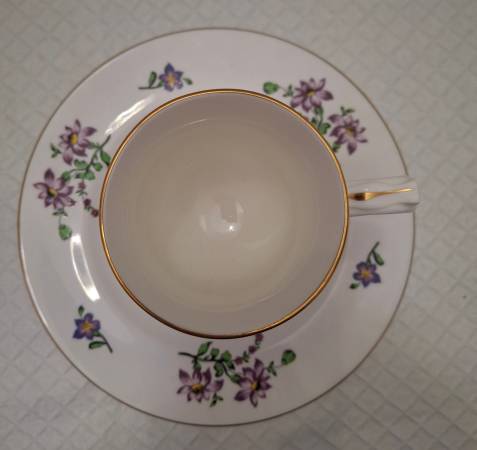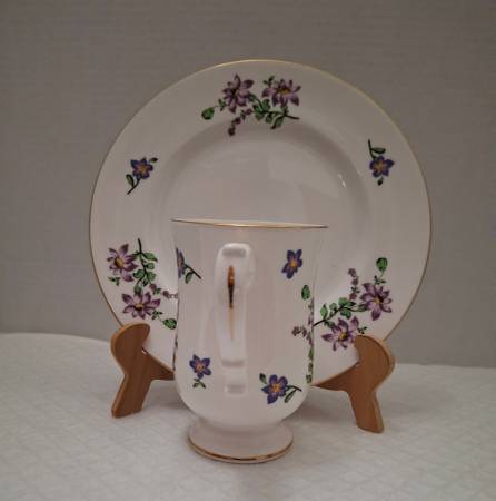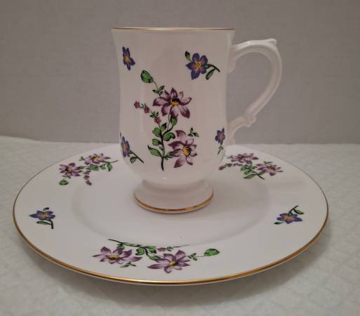 This mug and plate features scattered violets. Made in England by Royal Victoria, a brand of Crown Staffordshire China Co. Ltd, a company with roots tracing back to 1801. This set is mid 20th century period, having been discontinued. Never used.