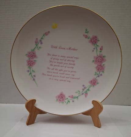 This 1980s collector plate features a border of pink roses, small purple flowers, green foliage and a small yellow butterfly , surrounding the phrase “With Love, Mother” in pink script. Gold gilding along the rim.