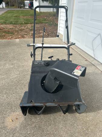 2 cycle, gas operated engine; has 20” throat and 4 1/2” adjustable snow chute; just added a newer snow plate.