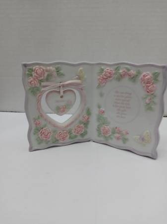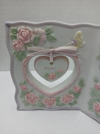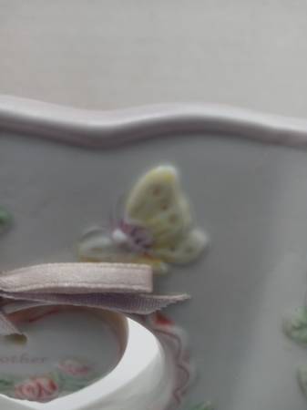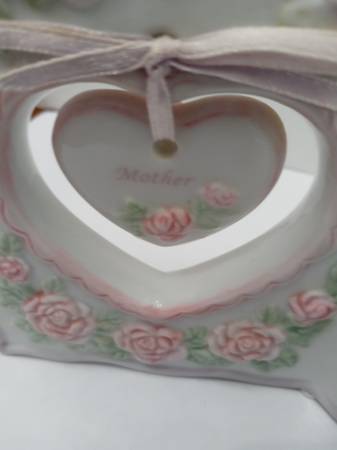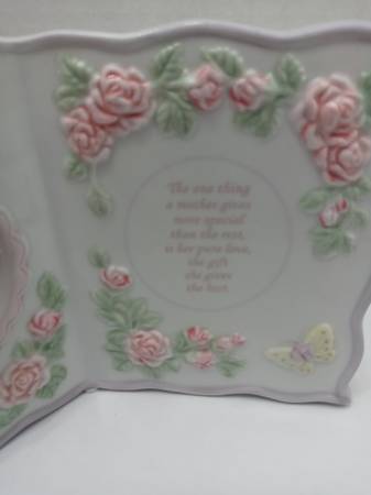 Beautiful ceramic plaque celebrating mothers with an adorable dangling heart charm. This sweet decorative piece makes the perfect gift for Mother's Day, birthdays, or any time you want to show mom how special she is. Dimensions are 4” high X 6” wide. Raised pink roses and two butterflies. Edging is light purple. A heart-shaped opening on the left side contains a small heart charm with the word ‘Mother’. The right side has these words: The one thing a mother gives more special than the rest, is her pure love, the gift she gives the best. Perfect for mother's office or workspace.