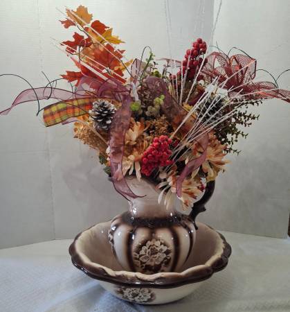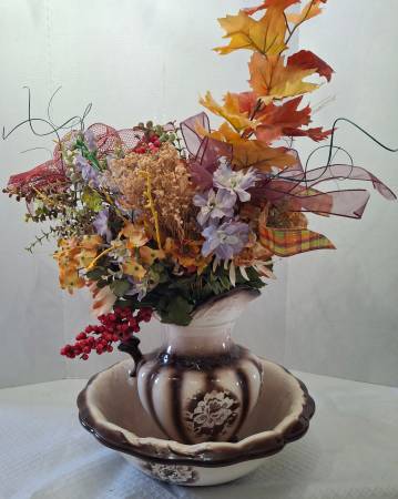 The set measures approximately 27” to the top of the floral arrangement, with the pitcher’s handle reaching about 13” high, and the basin has a 16” rim diameter and 5” height. It’s a stunning decorative piece that complements rustic, shabby chic, or Victorian-inspired decor. Excellent condition.