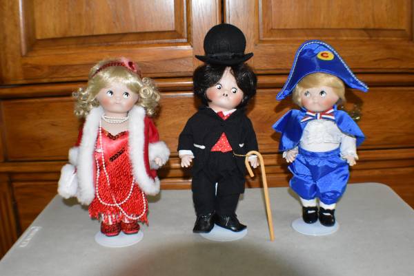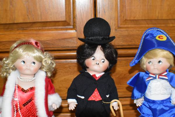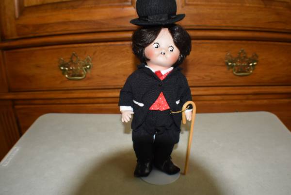 These three Vintage Dolls from 1994 are in Mint Condition. These dolls were never handled and were only on display in a wood display cabinet with glass panes. They came in a metal Soup can with tissue and certificates of authenticity. The dolls are 10 inches tall, not counting the hats. They are porcelain designed by Patricia Loveless with original stands. The Soup cans are in perfect condition, no tears or rust. Others are sold as used with flaws and the cans have imperfections. even rust. Each doll can be shipped with the cans for $12. The Dolls are George Washington, Charlie Chaplin and Flapper Doll. E-mail me if interested.