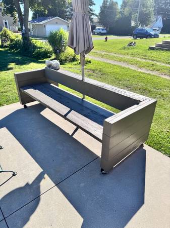 Very solid well built 8 foot wolmanized wood exterior couch with wheels in good condition. Solid with wheels. Need two people and a pick up truck to pick up. Looking to go to a good home for free pick up today.